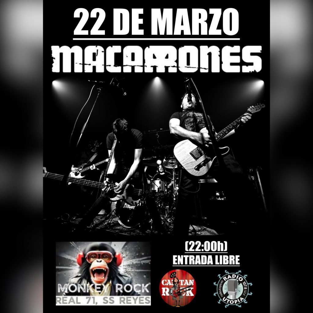 Buenas, Macarrones es una excelente banda de rock ‘n’ rollo con una intensa trayectoria. Radio Utopía vuelve a traerte conciertos para este próximo viernes 22 de marzo a las 22 horas en el Monkey Rock de Sanse, esperamos que os guste, Salud y Rock and Roll y…. gracias por el apoyo ENTRADA GRATUITA!! hasta completar
